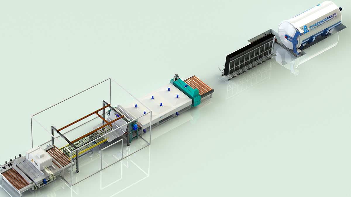 Semi-automatic laminated glass production line is mainly composed of: glass washing and drying machine, lamination table, simple walking sucker, electric PVB film laying machine, three-section film heating machine, final press and autoclave and other equipment.